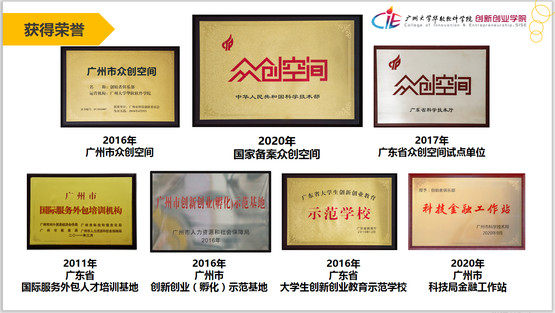 近年来,我校高度重视大学生创新创业教育工作,不断深化创新创业教育改革,“双创”教育工作取得了长足进展,先后被评为国家备案众创空间、广东省大学生创新创业教育示范学校(2016年-2019年)、广东省众创空间、广州市众创空间、广州市创新创业(孵化)示范基地、广州市众创空间港澳台青年创新创业基地、科技金融工作站等。